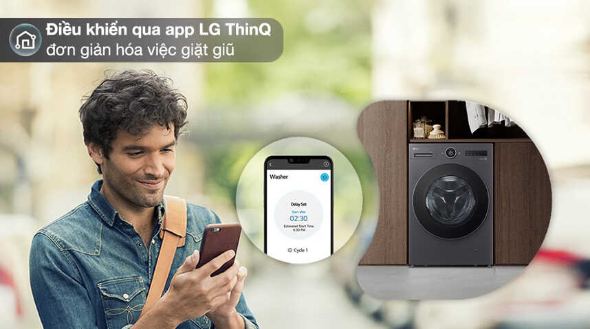 - Với ứng dụng LG ThinQ, bạn có thể điều khiển máy giặt từ xa ngay trên điện thoại, dù đang ở văn phòng hay trên đường về. Ứng dụng cho phép bật máy, chọn chương trình giặt, giám sát chu trình theo thời gian thực, hiển thị thời gian còn lại và thông báo khi kết thúc, giúp bạn chủ động sắp xếp công việc và quản lý việc giặt giũ tiện lợi hơn bao giờ hết.