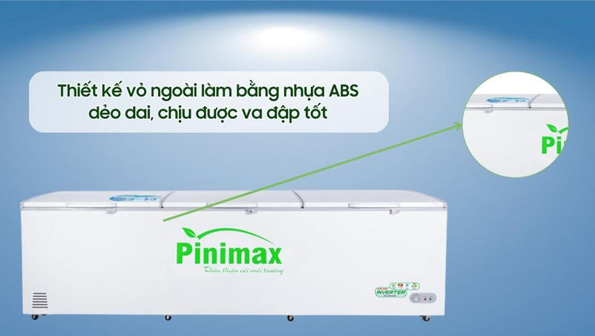 - Với thiết kế tiện lợi, quá trình lắp đặt và di chuyển tủ đông Pinimax 3 cánh PNM-139AF3 trở nên nhanh chóng, tiết kiệm thời gian và công sức. Thân tủ được làm từ nhựa ABS cao cấp có đặc tính dẻo dai, chống va đập tốt, giúp bảo vệ bề mặt tủ khỏi hư hỏng trong quá trình sử dụng. Lòng tủ được tráng phẳng, hỗ trợ sắp xếp thực phẩm gọn gàng, đồng thời dễ dàng vệ sinh, đảm bảo an toàn thực phẩm và giữ cho tủ luôn sạch sẽ, bền đẹp theo thời gian.