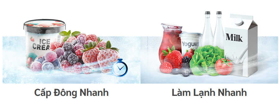 - Chế độ làm lạnh nhanh Quick Cool: Khi cần làm lạnh nhanh thực phẩm hoặc đồ uống, bạn chỉ cần bật chế độ Làm mát nhanh. Chế độ này giúp tăng cường luồng khí lạnh, làm mát nhanh hơn khoảng 29%*, rút ngắn thời gian chờ và giữ thực phẩm luôn ở trạng thái tươi ngon, sẵn sàng sử dụng.
