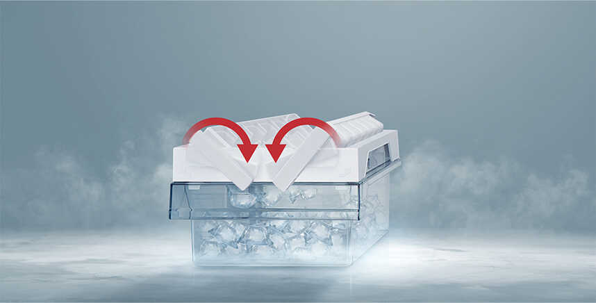 - Khay đá xoay tiện lợi, bạn chỉ cần thao tác xoay nhẹ là những viên đá mát lạnh sẽ rơi gọn vào hộp chứa, dễ dàng lấy ra khi cần. Đặc biệt, khi muốn làm đá nhanh hơn, bạn có thể bật chế độ Quick Freezing, giúp rút ngắn thời gian làm đá, luôn sẵn sàng mang đến sự tươi mát cho thức uống